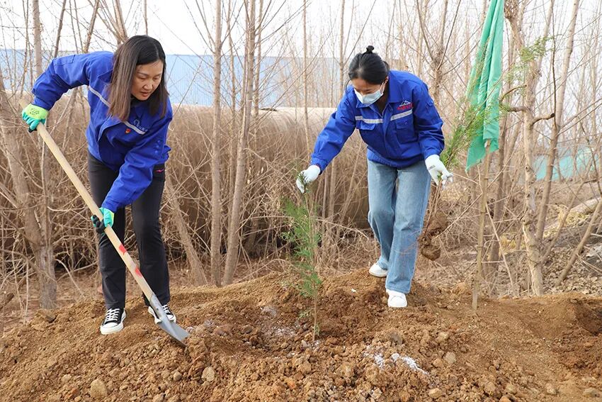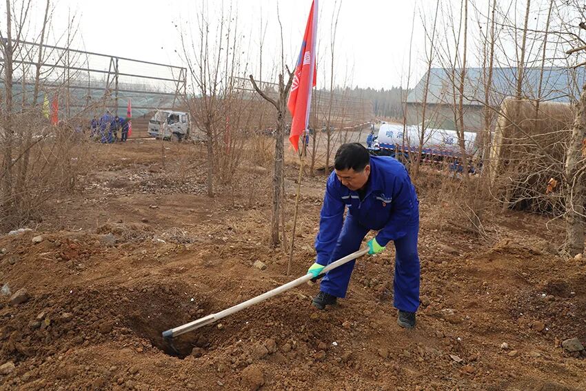 植树现场,大家热情高涨、干劲十足,挥锨铲土、挖坑扶苗、填坑夯苗、培土踩实,每一道工序都认真到位、一丝不苟、配合默契,共同种下一棵棵希望的树苗。